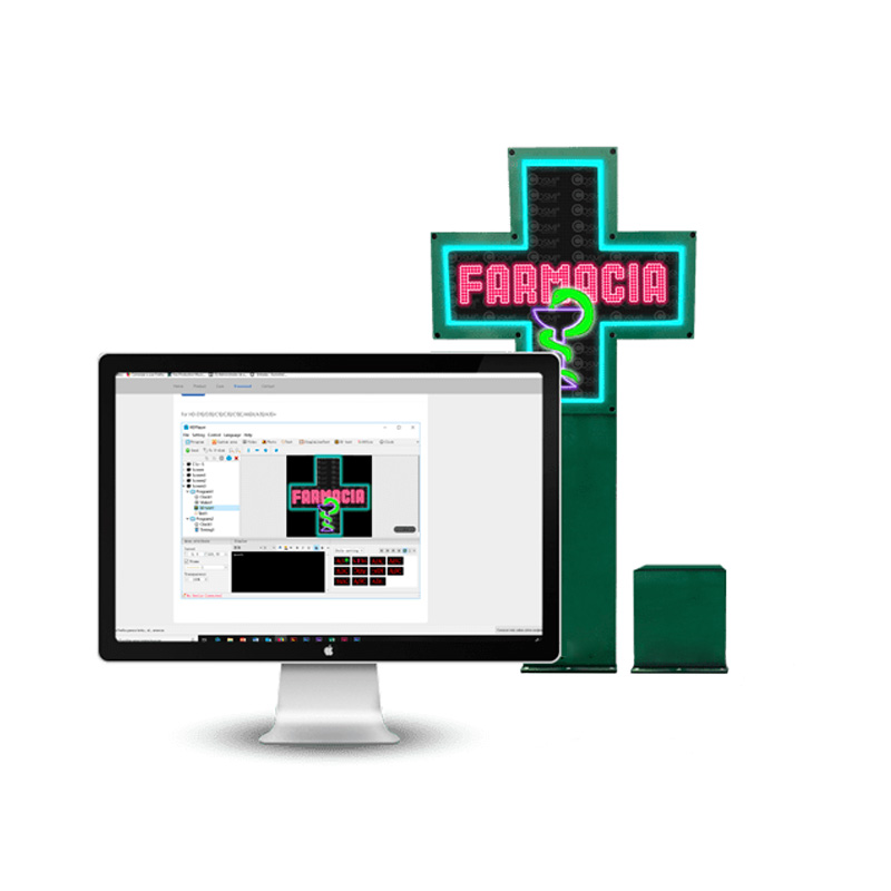 Cruz para farmacia con iluminación led, P6 para exteriores . Fabricada en alto brillo y bajo consumo, integrada en un solido chasis de metal. Dos pantallas con acceso en forma de libro.