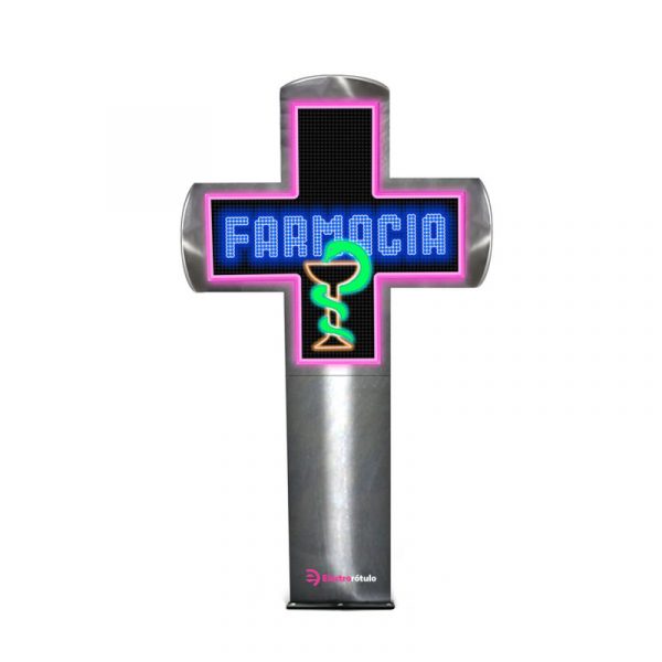 Cruz para farmacia, Pixel 8, Medialuna. Fabricada en alto brillo y bajo consumo, integrada en un sólido chasis de aluminio. Dos pantallas con acceso frontal a través de las placas LED.