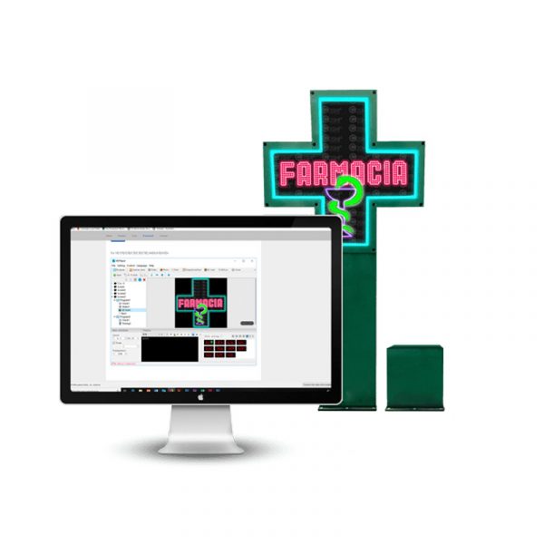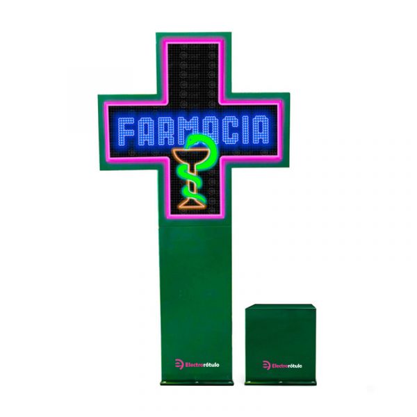 Cruz para farmacia, Pixel 8. Fabricada en alto brillo y bajo consumo, integrada en un solido chasis de metal dos pantallas con acceso en forma de libro.