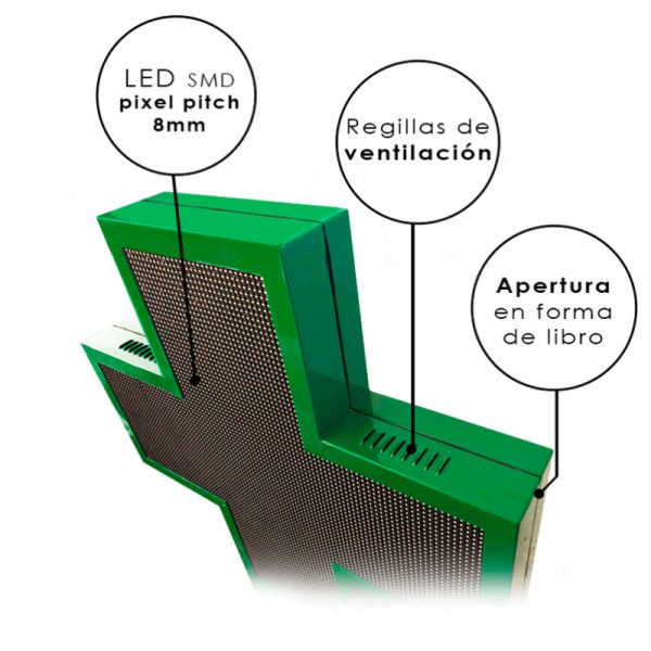 Toda la gama de cruces para farmacia de Electrorotulo, han sido fabricadas bajo estrictos controles de calidad y con la posibilidad de ofrecer alrededor de 16 millones de colores por medio de sus LED SMD. Ofrece la posibilidad de colocar videos, imágenes, ofertas, el tiempo, reloj o información importante, a diferencia de las cruces de led convencionales, que sólo conseguían pasar textos, números y crear gráficos de muy baja resolución.